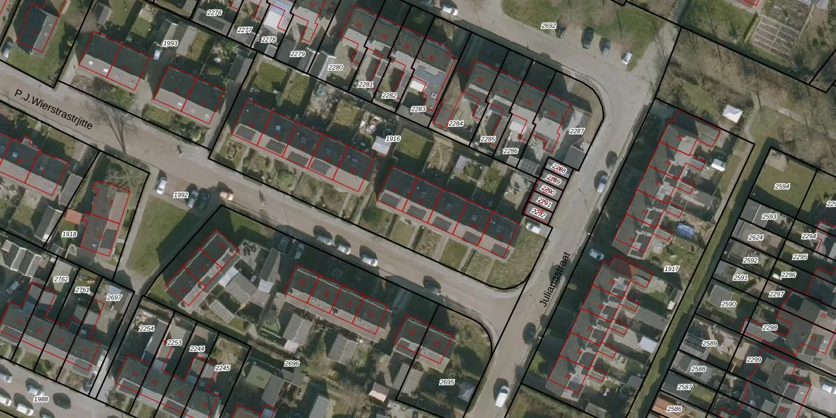 Het perceel waarop P.J.Wierstrastrjitte 25 staat heeft een oppervlakte van 2220 m². Dit is een zeer groot perceel. De perceeloppervlakte wordt geregistreerd door het Kadaster. Gedetailleerde informatie over de maten van dit perceel kunt u vinden in het rapport Kadastrale kaart met maatvoering van P.J.Wierstrastrjitte 25.