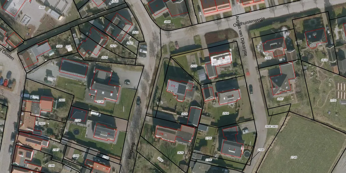 Het perceel waarop Ringweg 27-A staat heeft een oppervlakte van 715 m². Dit is een groot perceel. De perceeloppervlakte wordt geregistreerd door het Kadaster. Gedetailleerde informatie over de maten van dit perceel kunt u vinden in het rapport Kadastrale kaart met maatvoering van Ringweg 27-A.