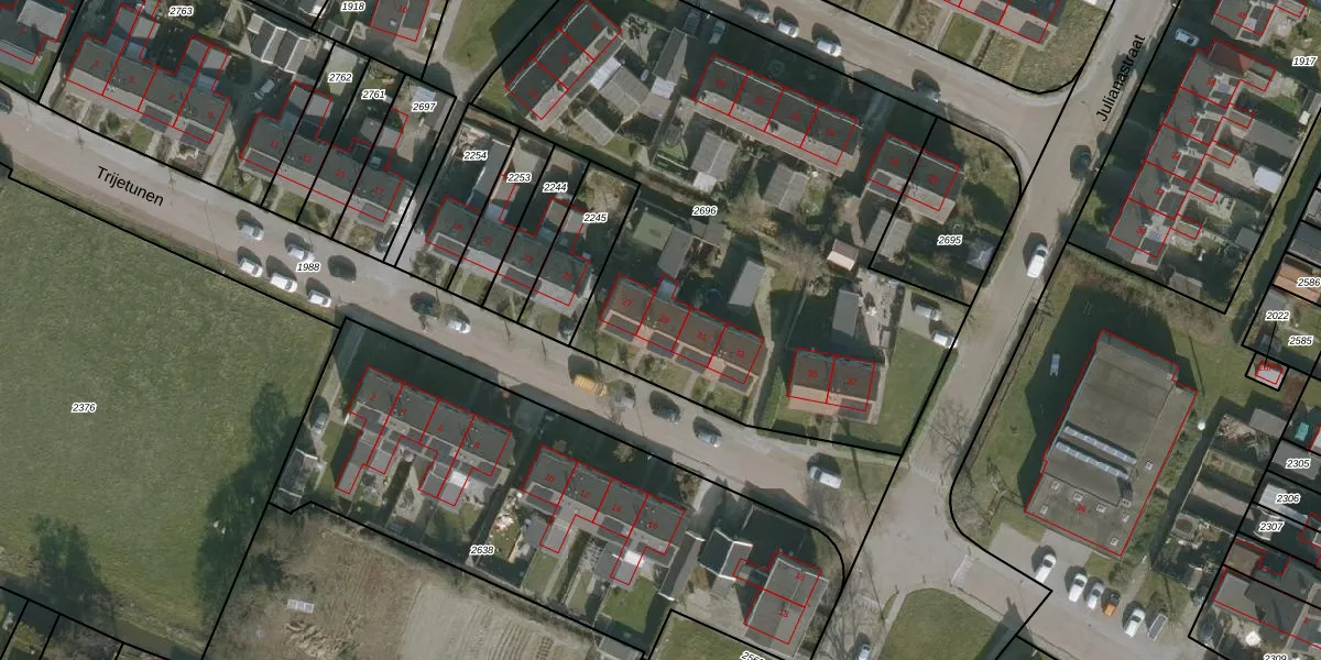 Het perceel waarop Trijetunen 29 staat heeft een oppervlakte van 3151 m². Dit is een zeer groot perceel. De perceeloppervlakte wordt geregistreerd door het Kadaster. Gedetailleerde informatie over de maten van dit perceel kunt u vinden in het rapport Kadastrale kaart met maatvoering van Trijetunen 29.