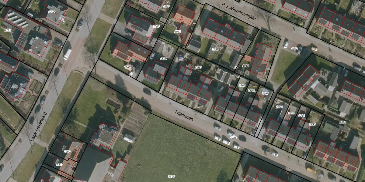 Het perceel waarop Trijetunen 5 staat heeft een oppervlakte van 1054 m². Dit is een zeer groot perceel. De perceeloppervlakte wordt geregistreerd door het Kadaster. Gedetailleerde informatie over de maten van dit perceel kunt u vinden in het rapport Kadastrale kaart met maatvoering van Trijetunen 5.