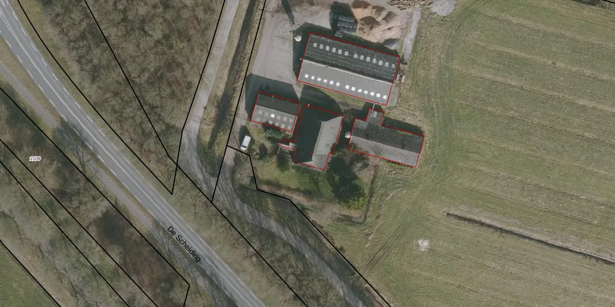 Het perceel waarop De Scheiding 1 staat heeft een oppervlakte van 5,3 ha. Dit is een zeer groot perceel. De perceeloppervlakte wordt geregistreerd door het Kadaster. Gedetailleerde informatie over de maten van dit perceel kunt u vinden in het rapport Kadastrale kaart met maatvoering van De Scheiding 1.