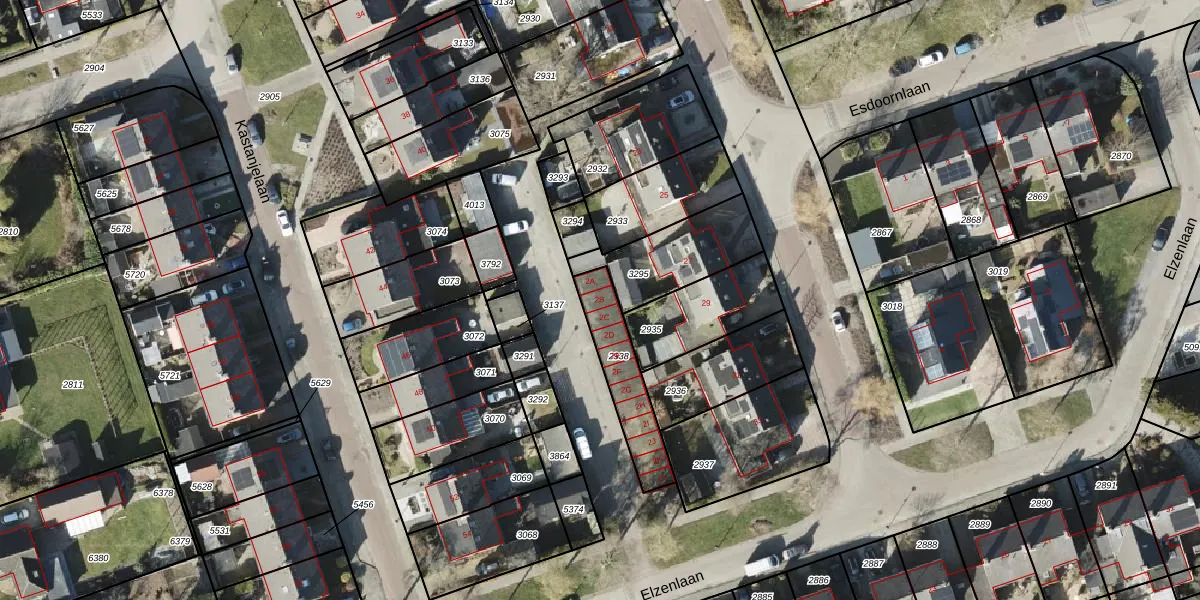 Elzenlaan 2-B is gelegen op kadastraal perceel MRM01F2938. Deze kadastrale aanduiding is uniek en wordt gebruikt door het Kadaster om eigendomsrechten en andere zakelijke rechten vast te leggen. Het perceel maakt onderdeel uit van de kadastrale gemeente Marum.