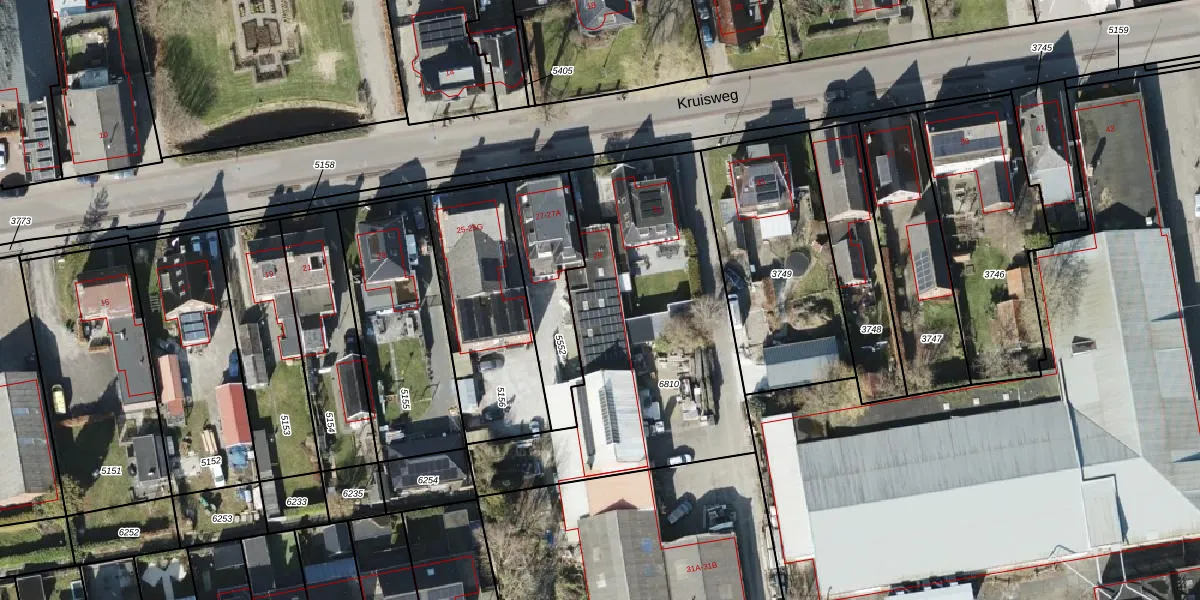 Het perceel waarop Kruisweg 29 staat heeft een oppervlakte van 1475 m². Dit is een zeer groot perceel. De perceeloppervlakte wordt geregistreerd door het Kadaster. Gedetailleerde informatie over de maten van dit perceel kunt u vinden in het rapport Kadastrale kaart met maatvoering van Kruisweg 29.