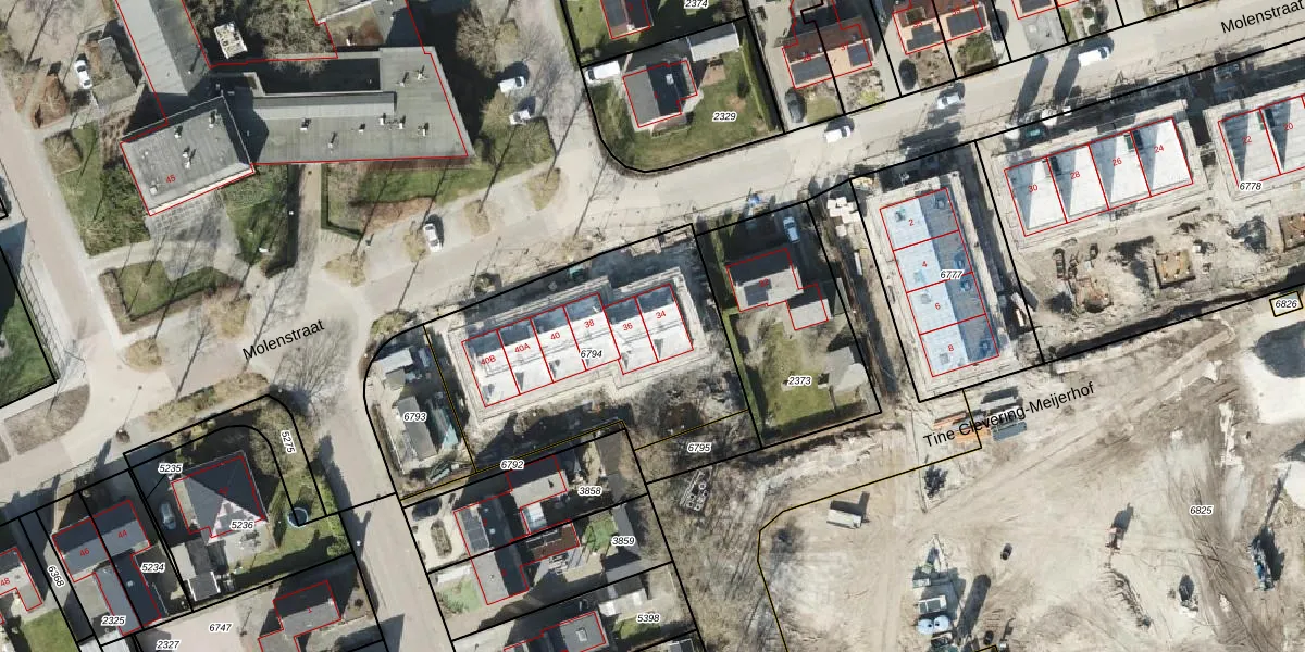 Het perceel waarop Molenstraat 34 staat heeft een oppervlakte van 1163 m². Dit is een zeer groot perceel. De perceeloppervlakte wordt geregistreerd door het Kadaster. Gedetailleerde informatie over de maten van dit perceel kunt u vinden in het rapport Kadastrale kaart met maatvoering van Molenstraat 34.