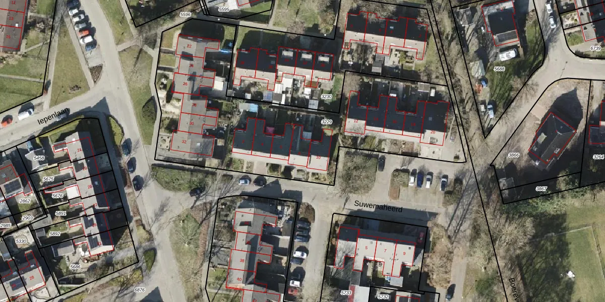 Het perceel waarop Suwemaheerd 8 staat heeft een oppervlakte van 2958 m². Dit is een zeer groot perceel. De perceeloppervlakte wordt geregistreerd door het Kadaster. Gedetailleerde informatie over de maten van dit perceel kunt u vinden in het rapport Kadastrale kaart met maatvoering van Suwemaheerd 8.