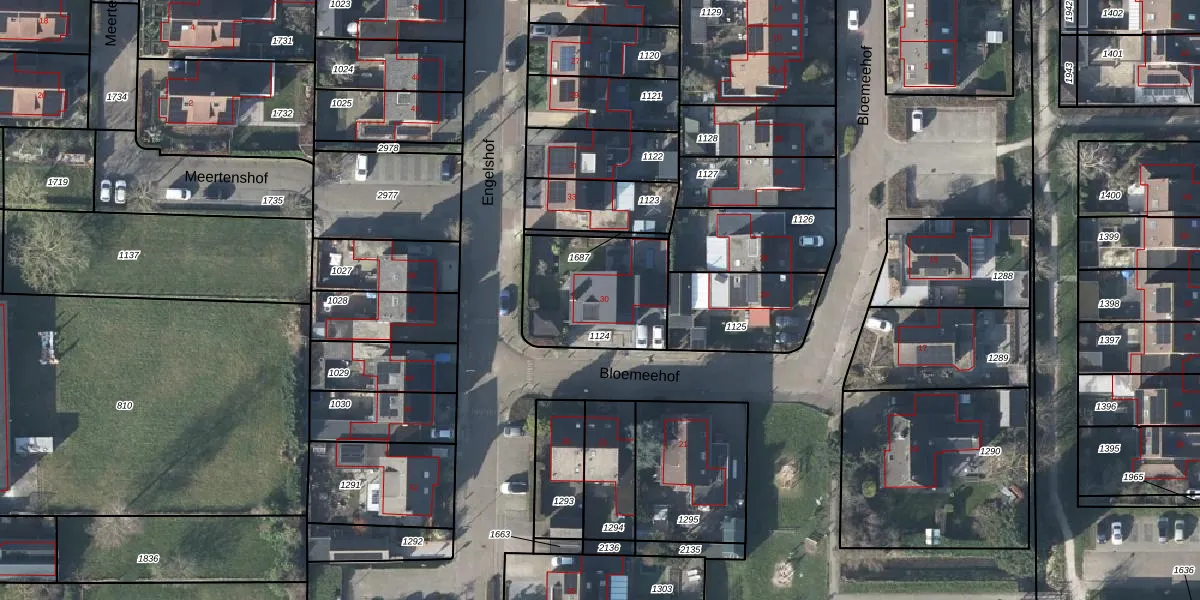 Het perceel waarop Bloemeehof 30 staat heeft een oppervlakte van 448 m². Dit is een groot perceel. De perceeloppervlakte wordt geregistreerd door het Kadaster. Gedetailleerde informatie over de maten van dit perceel kunt u vinden in het rapport Kadastrale kaart met maatvoering van Bloemeehof 30.