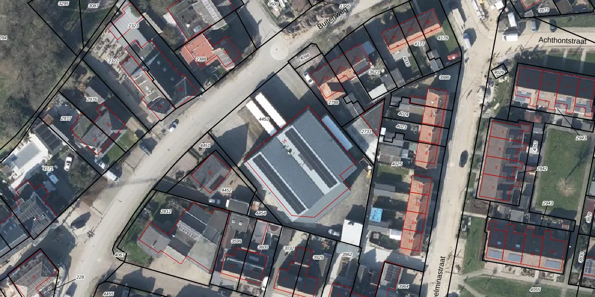 Het perceel waarop Buitenweg 16 staat heeft een oppervlakte van 2015 m². Dit is een zeer groot perceel. De perceeloppervlakte wordt geregistreerd door het Kadaster. Gedetailleerde informatie over de maten van dit perceel kunt u vinden in het rapport Kadastrale kaart met maatvoering van Buitenweg 16.