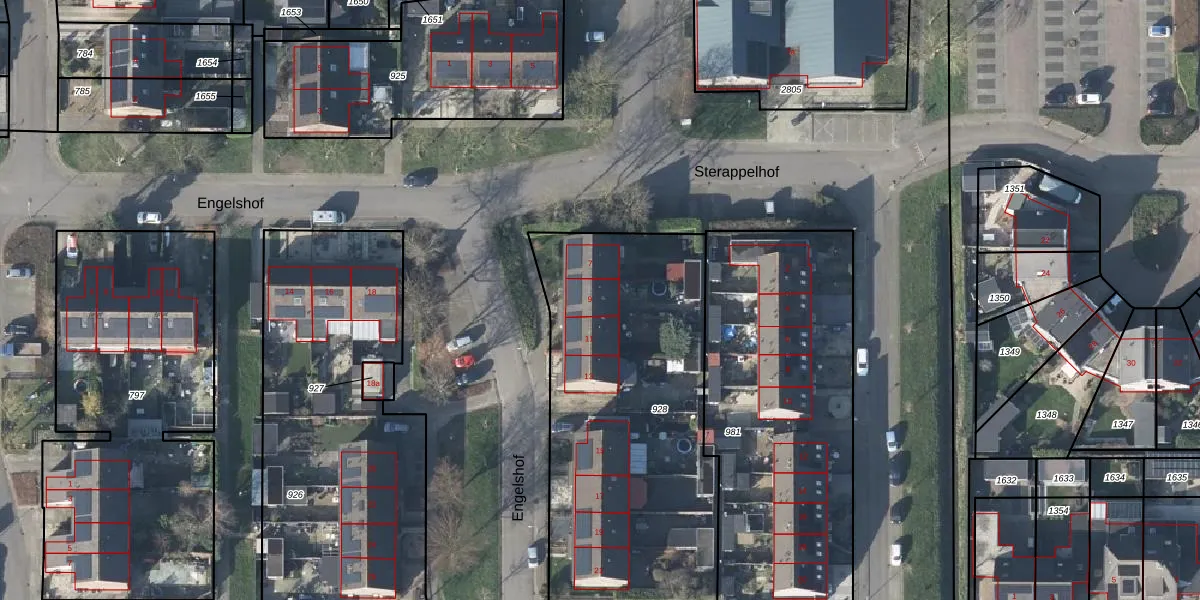 Het perceel waarop Engelshof 9 staat heeft een oppervlakte van 1655 m². Dit is een zeer groot perceel. De perceeloppervlakte wordt geregistreerd door het Kadaster. Gedetailleerde informatie over de maten van dit perceel kunt u vinden in het rapport Kadastrale kaart met maatvoering van Engelshof 9.