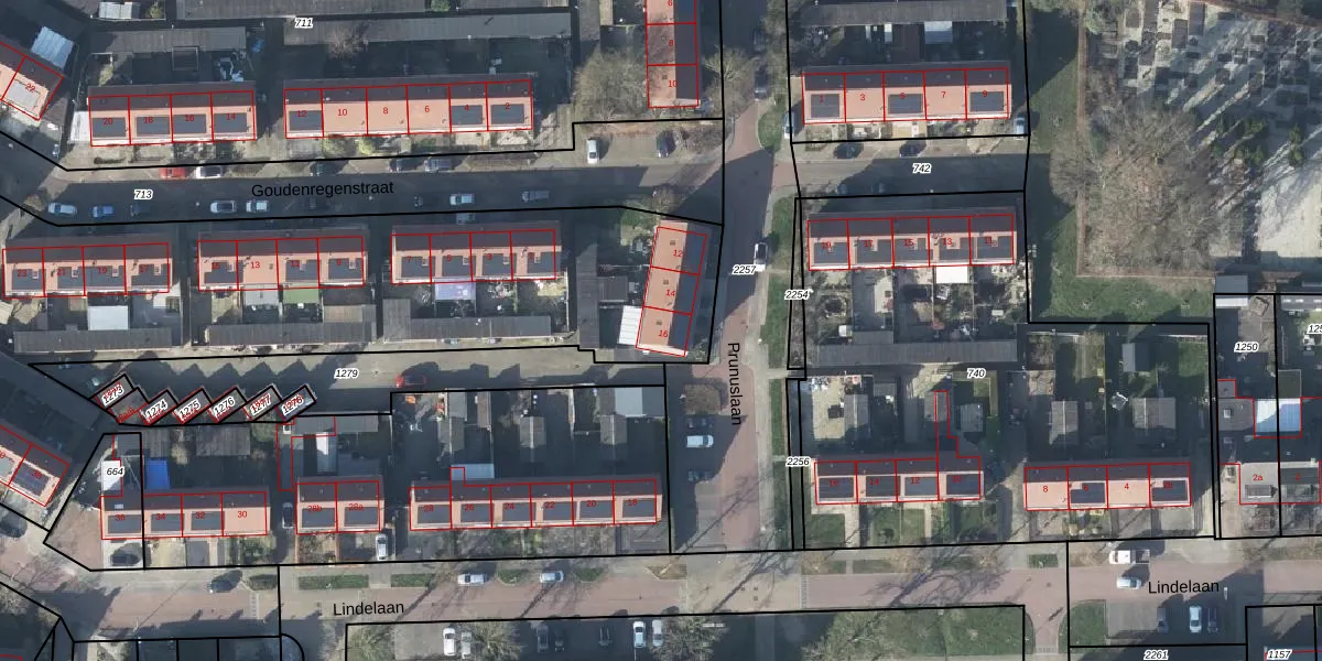 Het perceel waarop Prunuslaan 16 staat heeft een oppervlakte van 6570 m². Dit is een zeer groot perceel. De perceeloppervlakte wordt geregistreerd door het Kadaster. Gedetailleerde informatie over de maten van dit perceel kunt u vinden in het rapport Kadastrale kaart met maatvoering van Prunuslaan 16.