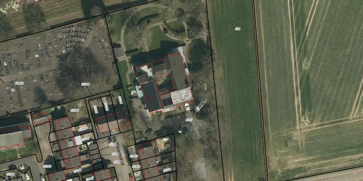 Het perceel waarop Hilleshagerweg 11-D staat heeft een oppervlakte van 4859 m². Dit is een zeer groot perceel. De perceeloppervlakte wordt geregistreerd door het Kadaster. Gedetailleerde informatie over de maten van dit perceel kunt u vinden in het rapport Kadastrale kaart met maatvoering van Hilleshagerweg 11-D.