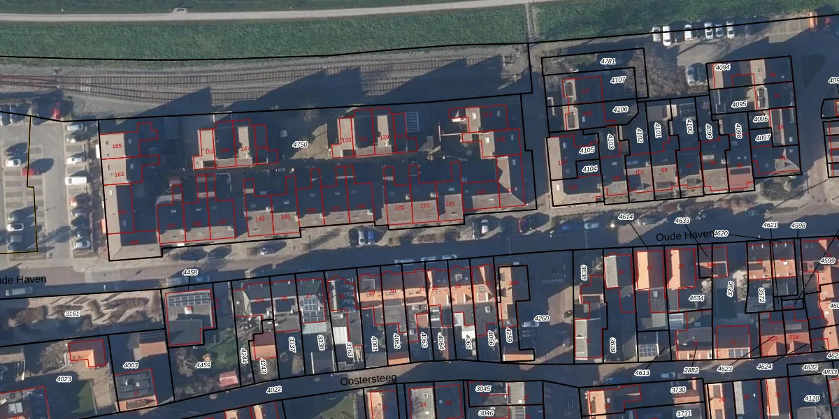 Het perceel waarop Oude Haven 123 staat heeft een oppervlakte van 3038 m². Dit is een zeer groot perceel. De perceeloppervlakte wordt geregistreerd door het Kadaster. Gedetailleerde informatie over de maten van dit perceel kunt u vinden in het rapport Kadastrale kaart met maatvoering van Oude Haven 123.