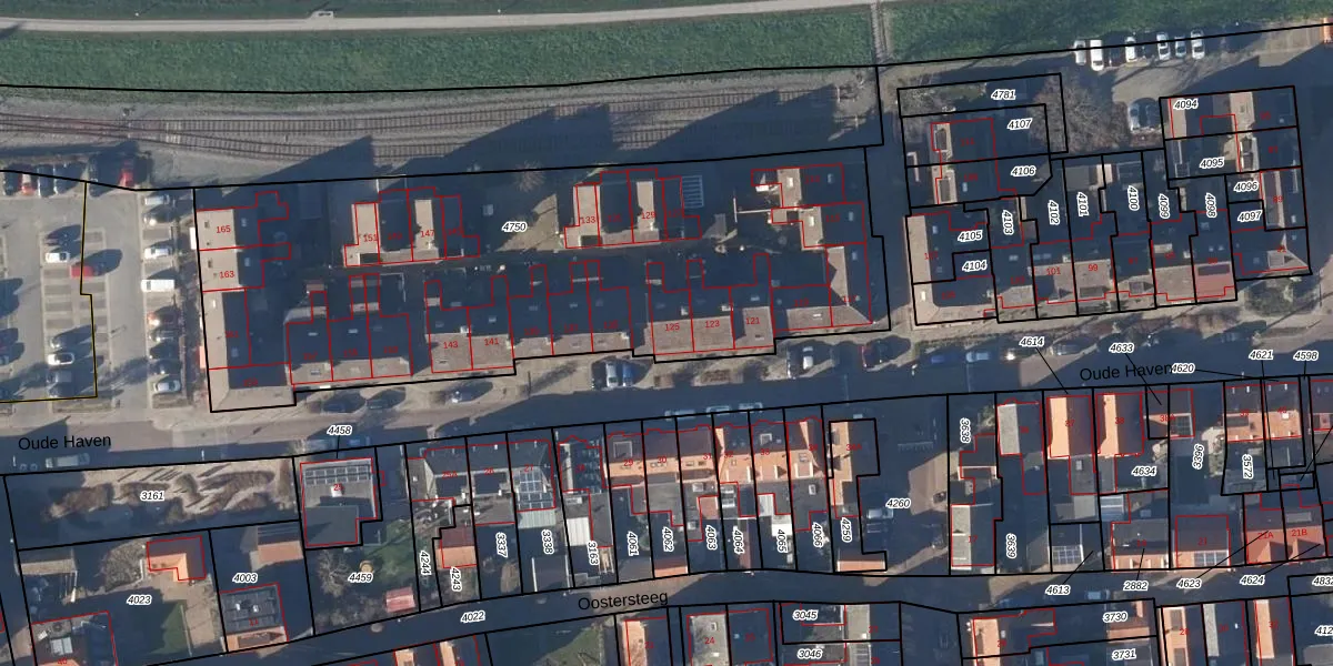 Het perceel waarop Oude Haven 125 staat heeft een oppervlakte van 3038 m². Dit is een zeer groot perceel. De perceeloppervlakte wordt geregistreerd door het Kadaster. Gedetailleerde informatie over de maten van dit perceel kunt u vinden in het rapport Kadastrale kaart met maatvoering van Oude Haven 125.