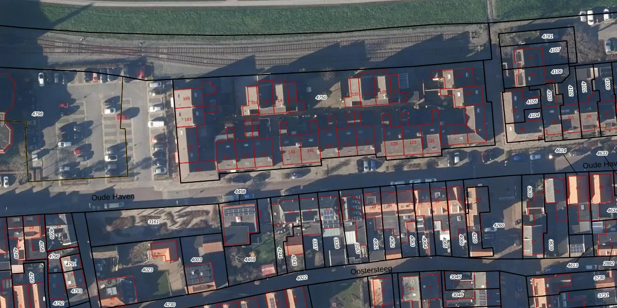 Het perceel waarop Oude Haven 141 staat heeft een oppervlakte van 3038 m². Dit is een zeer groot perceel. De perceeloppervlakte wordt geregistreerd door het Kadaster. Gedetailleerde informatie over de maten van dit perceel kunt u vinden in het rapport Kadastrale kaart met maatvoering van Oude Haven 141.