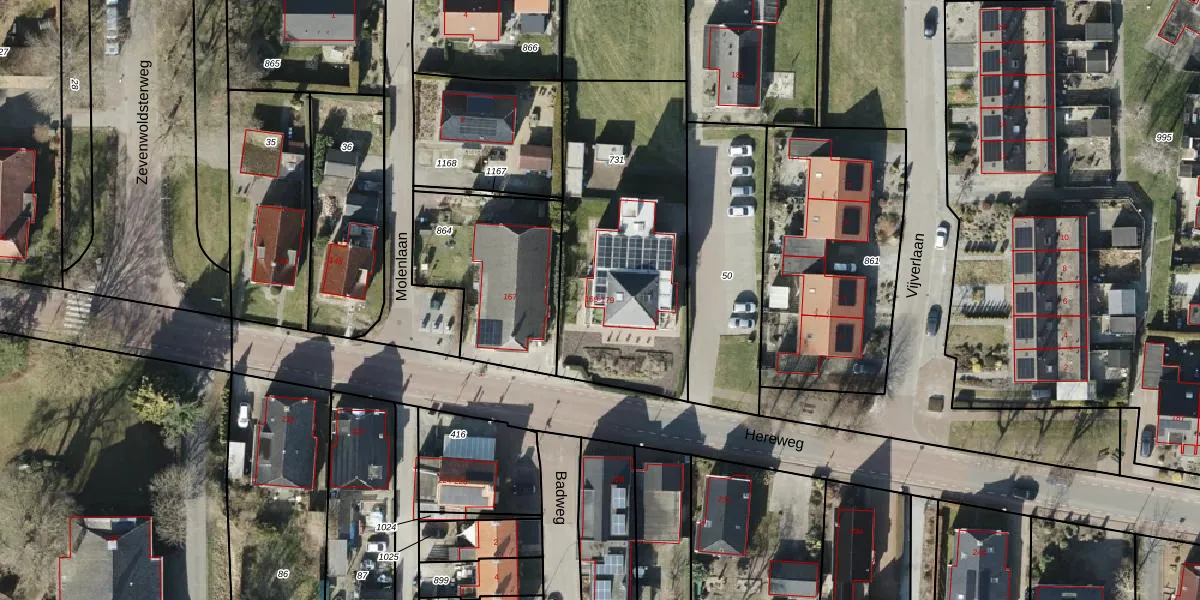 Het perceel waarop Hereweg 169 staat heeft een oppervlakte van 1087 m². Dit is een zeer groot perceel. De perceeloppervlakte wordt geregistreerd door het Kadaster. Gedetailleerde informatie over de maten van dit perceel kunt u vinden in het rapport Kadastrale kaart met maatvoering van Hereweg 169.
