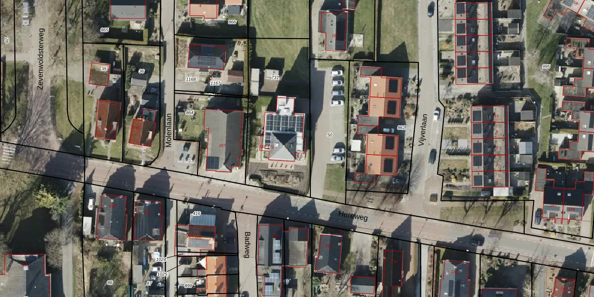 Het perceel waarop Hereweg 171 staat heeft een oppervlakte van 1087 m². Dit is een zeer groot perceel. De perceeloppervlakte wordt geregistreerd door het Kadaster. Gedetailleerde informatie over de maten van dit perceel kunt u vinden in het rapport Kadastrale kaart met maatvoering van Hereweg 171.
