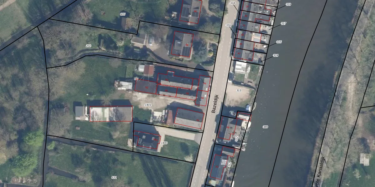 Het perceel waarop Bazeldijk 58 staat heeft een oppervlakte van 3373 m². Dit is een zeer groot perceel. De perceeloppervlakte wordt geregistreerd door het Kadaster. Gedetailleerde informatie over de maten van dit perceel kunt u vinden in het rapport Kadastrale kaart met maatvoering van Bazeldijk 58.