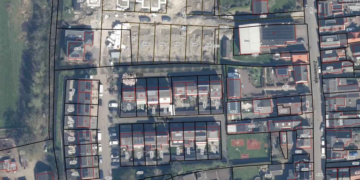 Het perceel waarop Het Bos 26 staat heeft een oppervlakte van 303 m². Dit is een groot perceel. De perceeloppervlakte wordt geregistreerd door het Kadaster. Gedetailleerde informatie over de maten van dit perceel kunt u vinden in het rapport Kadastrale kaart met maatvoering van Het Bos 26.