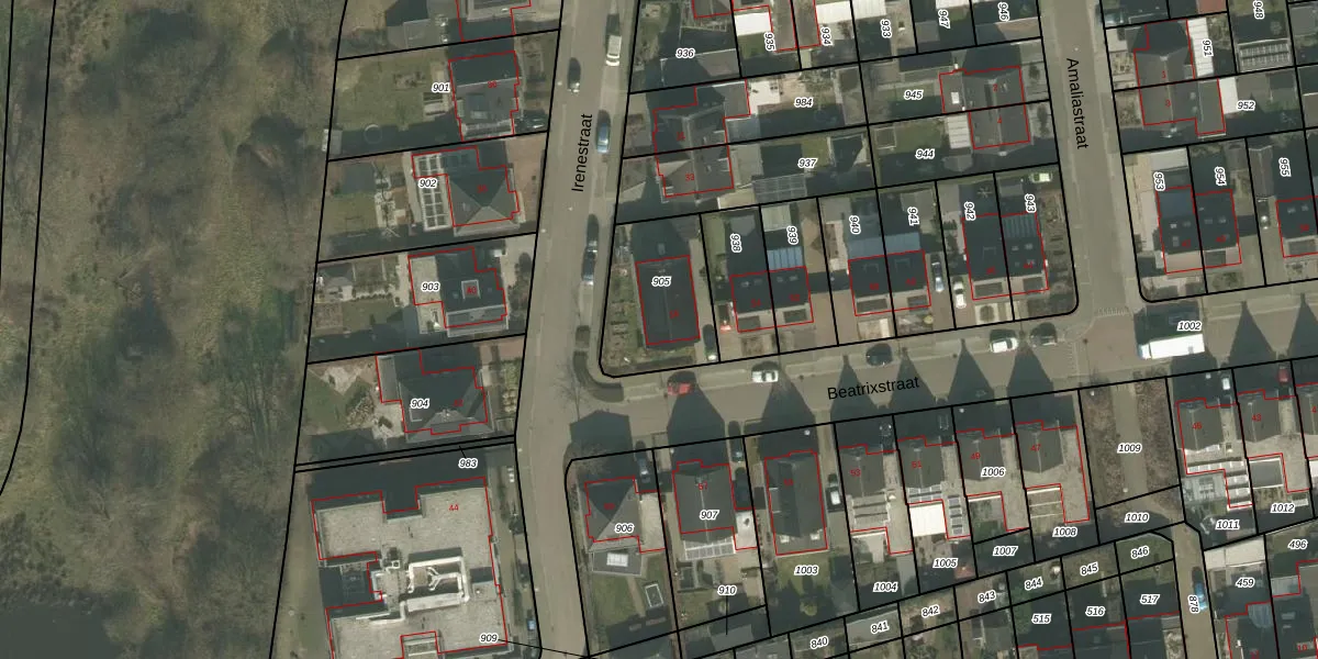 Het perceel waarop Beatrixstraat 56 staat heeft een oppervlakte van 360 m². Dit is een groot perceel. De perceeloppervlakte wordt geregistreerd door het Kadaster. Gedetailleerde informatie over de maten van dit perceel kunt u vinden in het rapport Kadastrale kaart met maatvoering van Beatrixstraat 56.