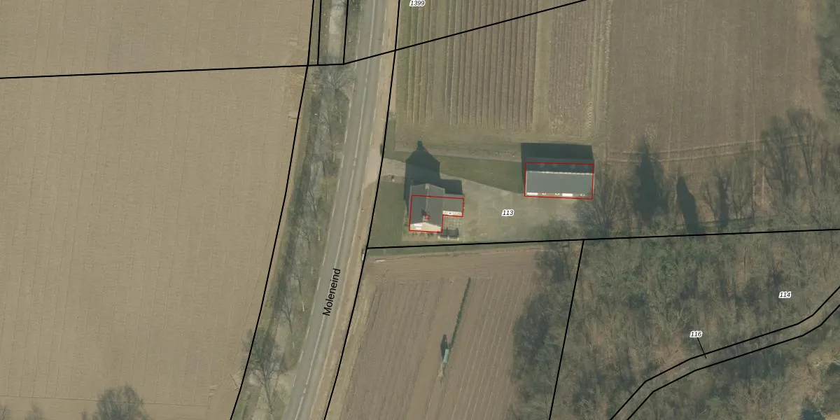 Moleneind 12 is gelegen op kadastraal perceel MLO02H113. Deze kadastrale aanduiding is uniek en wordt gebruikt door het Kadaster om eigendomsrechten en andere zakelijke rechten vast te leggen. Het perceel maakt onderdeel uit van de kadastrale gemeente Meerlo.