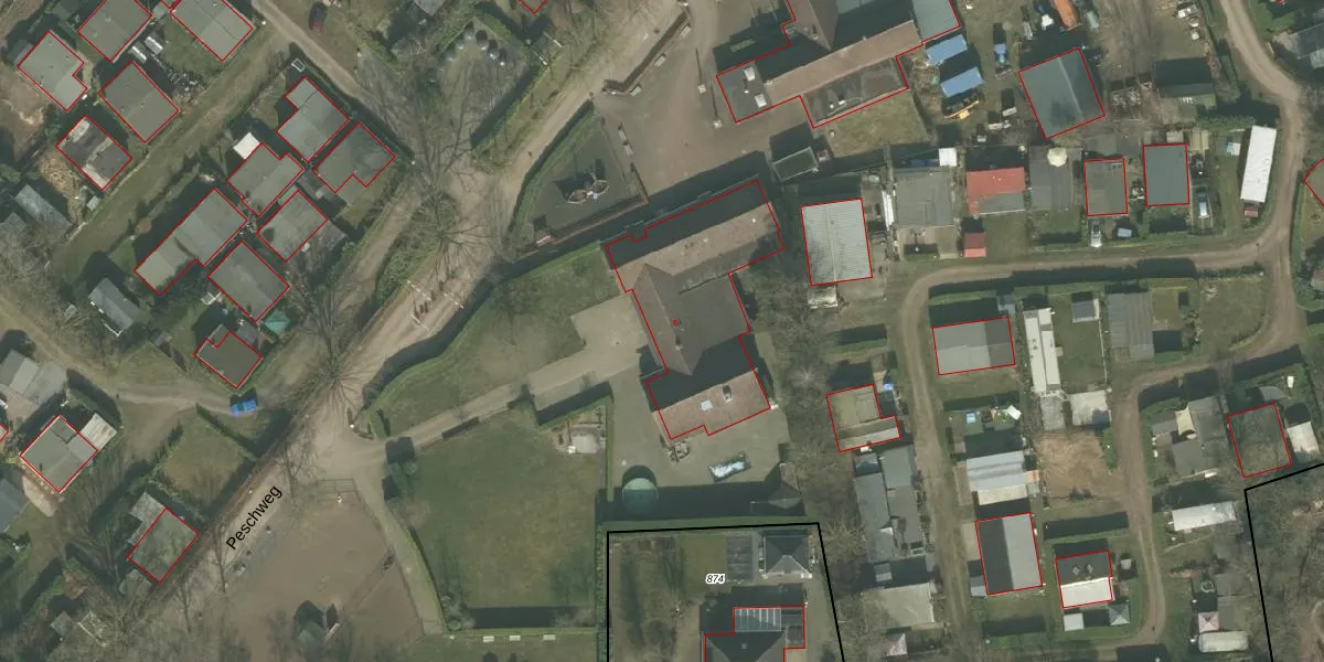 Het perceel waarop Peschweg 8 staat heeft een oppervlakte van 9,3 ha. Dit is een zeer groot perceel. De perceeloppervlakte wordt geregistreerd door het Kadaster. Gedetailleerde informatie over de maten van dit perceel kunt u vinden in het rapport Kadastrale kaart met maatvoering van Peschweg 8.
