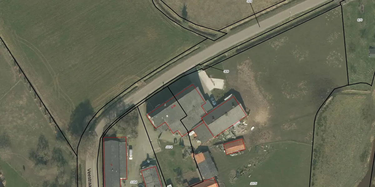 Het perceel waarop Veestraat 3 staat heeft een oppervlakte van 8596 m². Dit is een zeer groot perceel. De perceeloppervlakte wordt geregistreerd door het Kadaster. Gedetailleerde informatie over de maten van dit perceel kunt u vinden in het rapport Kadastrale kaart met maatvoering van Veestraat 3.