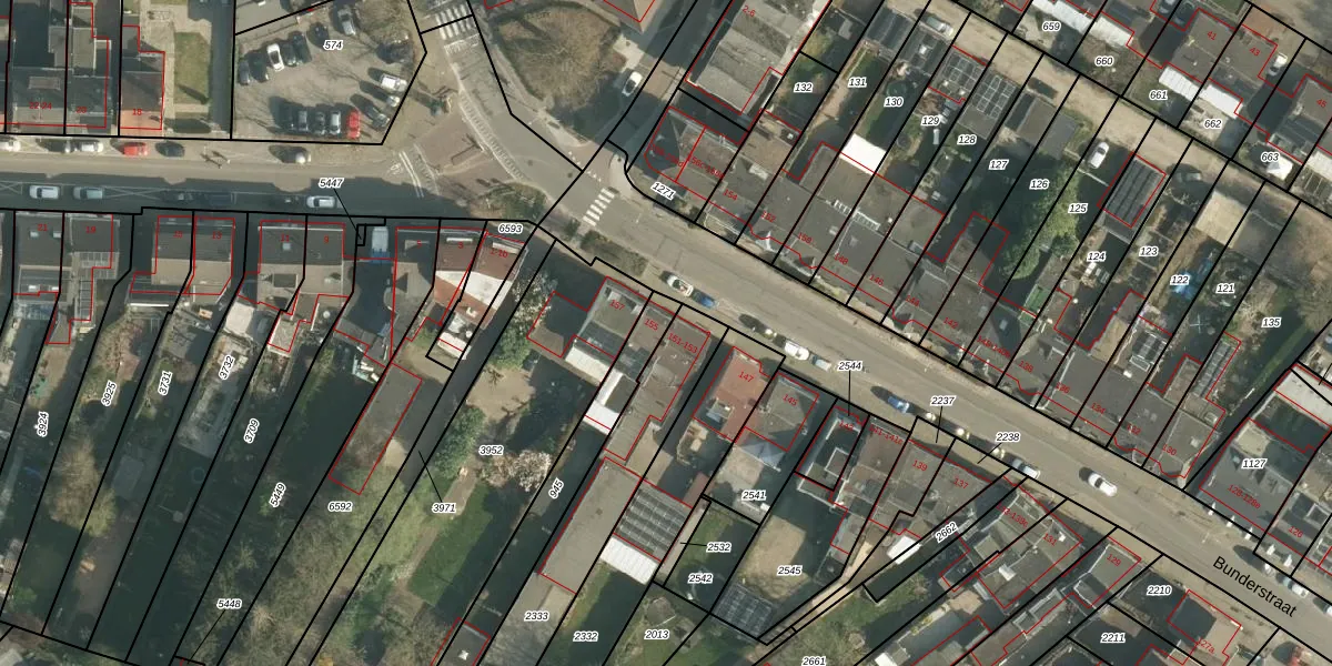 Het perceel waarop Bunderstraat 153 staat heeft een oppervlakte van 595 m². Dit is een groot perceel. De perceeloppervlakte wordt geregistreerd door het Kadaster. Gedetailleerde informatie over de maten van dit perceel kunt u vinden in het rapport Kadastrale kaart met maatvoering van Bunderstraat 153.