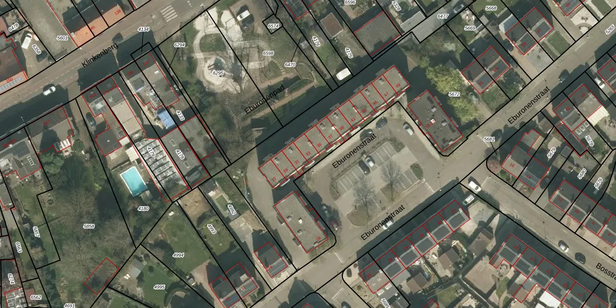 Eburonenstraat 33 is gelegen op kadastraal perceel MSN01B5672. Deze kadastrale aanduiding is uniek en wordt gebruikt door het Kadaster om eigendomsrechten en andere zakelijke rechten vast te leggen. Het perceel maakt onderdeel uit van de kadastrale gemeente Meerssen.