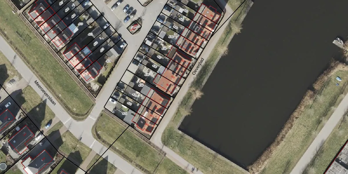 Oeverpad 361 is gelegen op kadastraal perceel GNG01AE435. Deze kadastrale aanduiding is uniek en wordt gebruikt door het Kadaster om eigendomsrechten en andere zakelijke rechten vast te leggen. Het perceel maakt onderdeel uit van de kadastrale gemeente Groningen.