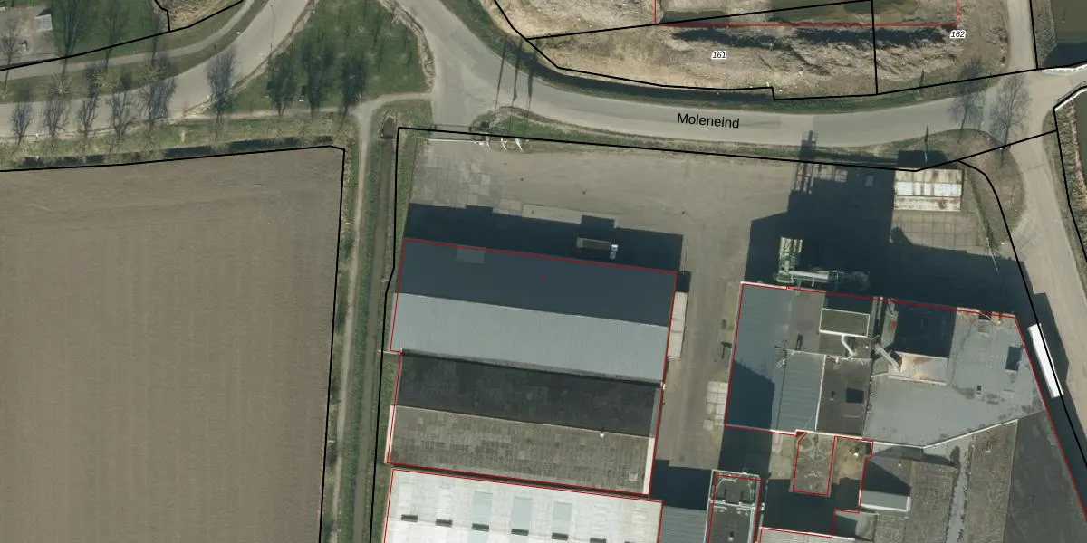 Het perceel waarop Moleneind 2 staat heeft een oppervlakte van 1,9 ha. Dit is een zeer groot perceel. De perceeloppervlakte wordt geregistreerd door het Kadaster. Gedetailleerde informatie over de maten van dit perceel kunt u vinden in het rapport Kadastrale kaart met maatvoering van Moleneind 2.