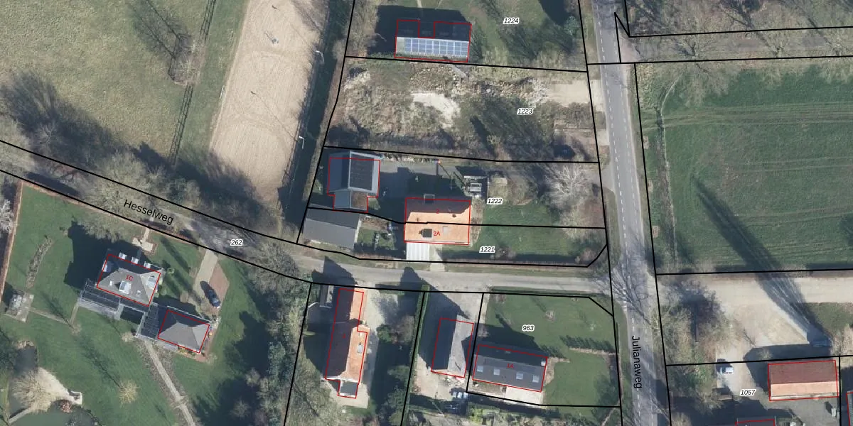 Het perceel waarop Hesselweg 2 staat heeft een oppervlakte van 1020 m². Dit is een zeer groot perceel. De perceeloppervlakte wordt geregistreerd door het Kadaster. Gedetailleerde informatie over de maten van dit perceel kunt u vinden in het rapport Kadastrale kaart met maatvoering van Hesselweg 2.