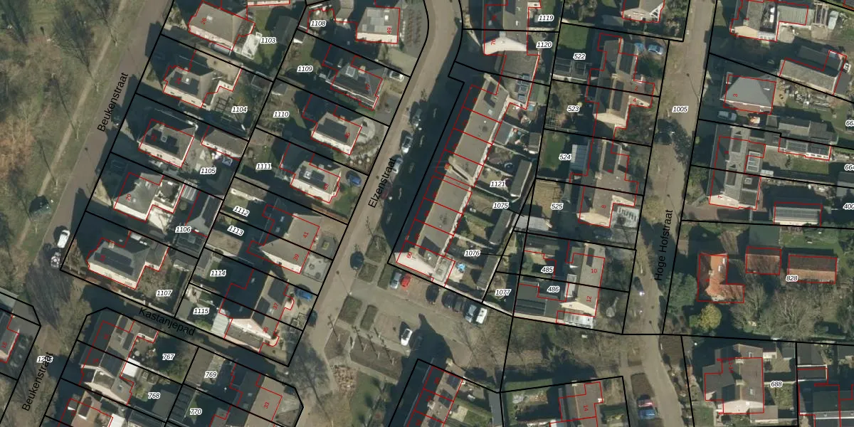 Het perceel waarop Elzenstraat 64 staat heeft een oppervlakte van 1207 m². Dit is een zeer groot perceel. De perceeloppervlakte wordt geregistreerd door het Kadaster. Gedetailleerde informatie over de maten van dit perceel kunt u vinden in het rapport Kadastrale kaart met maatvoering van Elzenstraat 64.