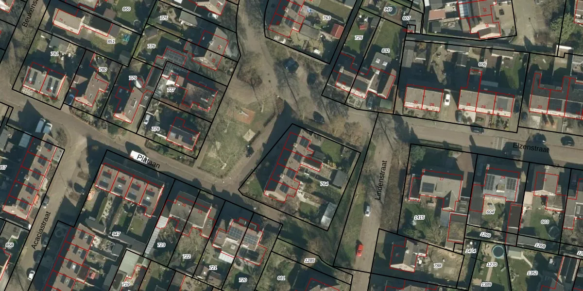 Het perceel waarop Plataan 1 staat heeft een oppervlakte van 868 m². Dit is een groot perceel. De perceeloppervlakte wordt geregistreerd door het Kadaster. Gedetailleerde informatie over de maten van dit perceel kunt u vinden in het rapport Kadastrale kaart met maatvoering van Plataan 1.