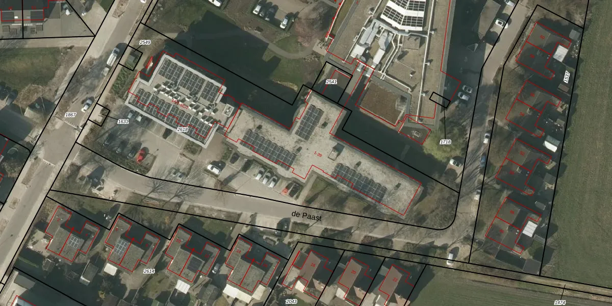 Het perceel waarop de Paast 1 staat heeft een oppervlakte van 3870 m². Dit is een zeer groot perceel. De perceeloppervlakte wordt geregistreerd door het Kadaster. Gedetailleerde informatie over de maten van dit perceel kunt u vinden in het rapport Kadastrale kaart met maatvoering van de Paast 1.