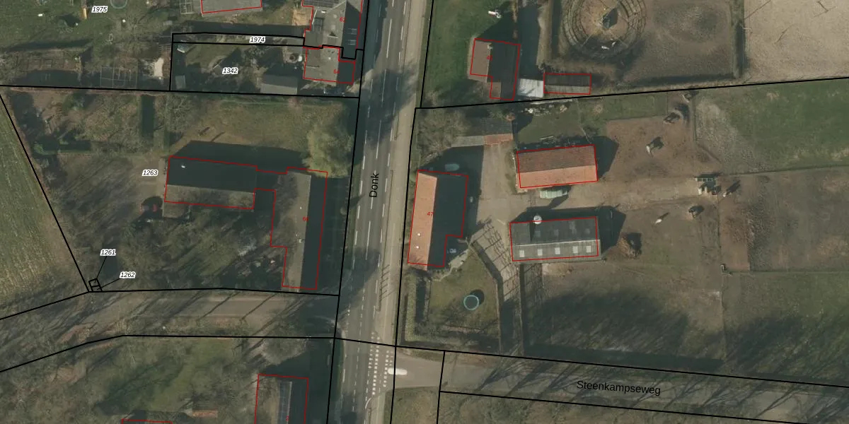 Het perceel waarop Donk 47 staat heeft een oppervlakte van 1,5 ha. Dit is een zeer groot perceel. De perceeloppervlakte wordt geregistreerd door het Kadaster. Gedetailleerde informatie over de maten van dit perceel kunt u vinden in het rapport Kadastrale kaart met maatvoering van Donk 47.