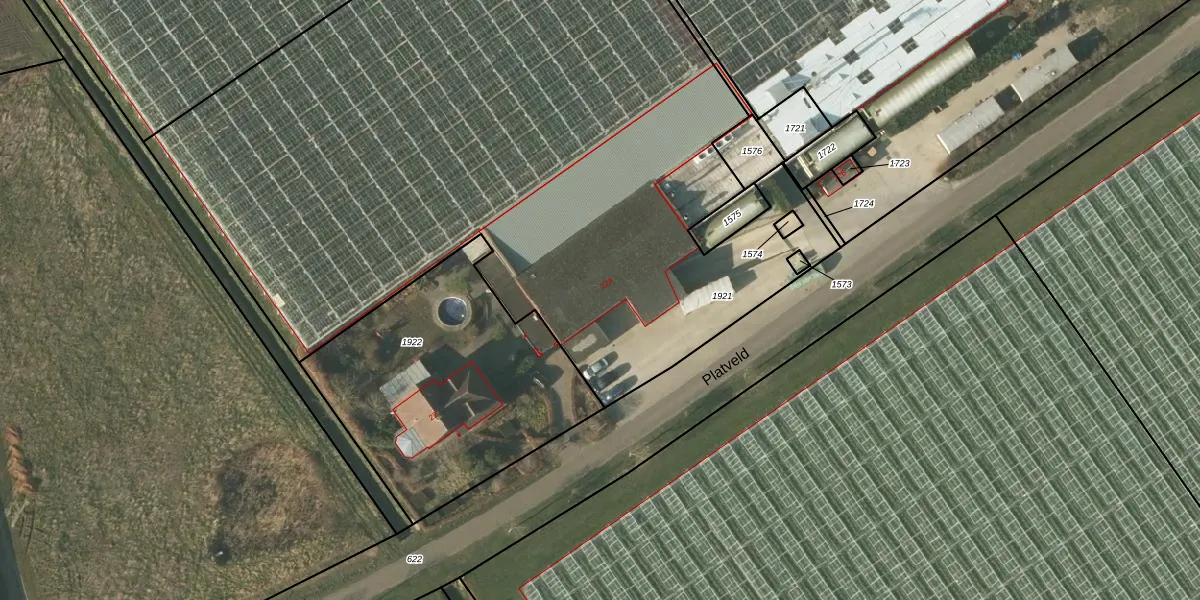 Het perceel waarop Platveld 22-A staat heeft een oppervlakte van 5390 m². Dit is een zeer groot perceel. De perceeloppervlakte wordt geregistreerd door het Kadaster. Gedetailleerde informatie over de maten van dit perceel kunt u vinden in het rapport Kadastrale kaart met maatvoering van Platveld 22-A.