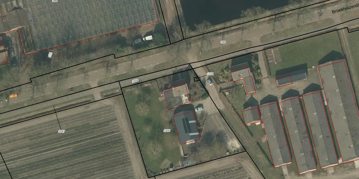 Het perceel waarop Broekhuizerdijk 24 staat heeft een oppervlakte van 2533 m². Dit is een zeer groot perceel. De perceeloppervlakte wordt geregistreerd door het Kadaster. Gedetailleerde informatie over de maten van dit perceel kunt u vinden in het rapport Kadastrale kaart met maatvoering van Broekhuizerdijk 24.