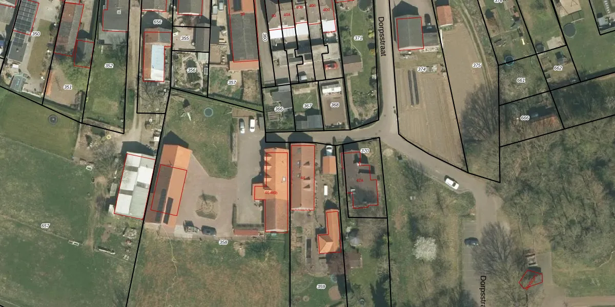 Het perceel waarop Dorpsstraat 44 staat heeft een oppervlakte van 1680 m². Dit is een zeer groot perceel. De perceeloppervlakte wordt geregistreerd door het Kadaster. Gedetailleerde informatie over de maten van dit perceel kunt u vinden in het rapport Kadastrale kaart met maatvoering van Dorpsstraat 44.