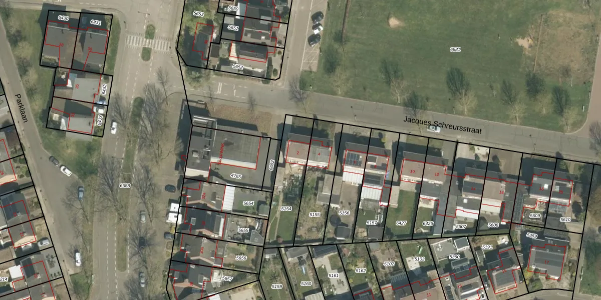 Het perceel waarop Jacques Schreursstraat 2 staat heeft een oppervlakte van 430 m². Dit is een groot perceel. De perceeloppervlakte wordt geregistreerd door het Kadaster. Gedetailleerde informatie over de maten van dit perceel kunt u vinden in het rapport Kadastrale kaart met maatvoering van Jacques Schreursstraat 2.