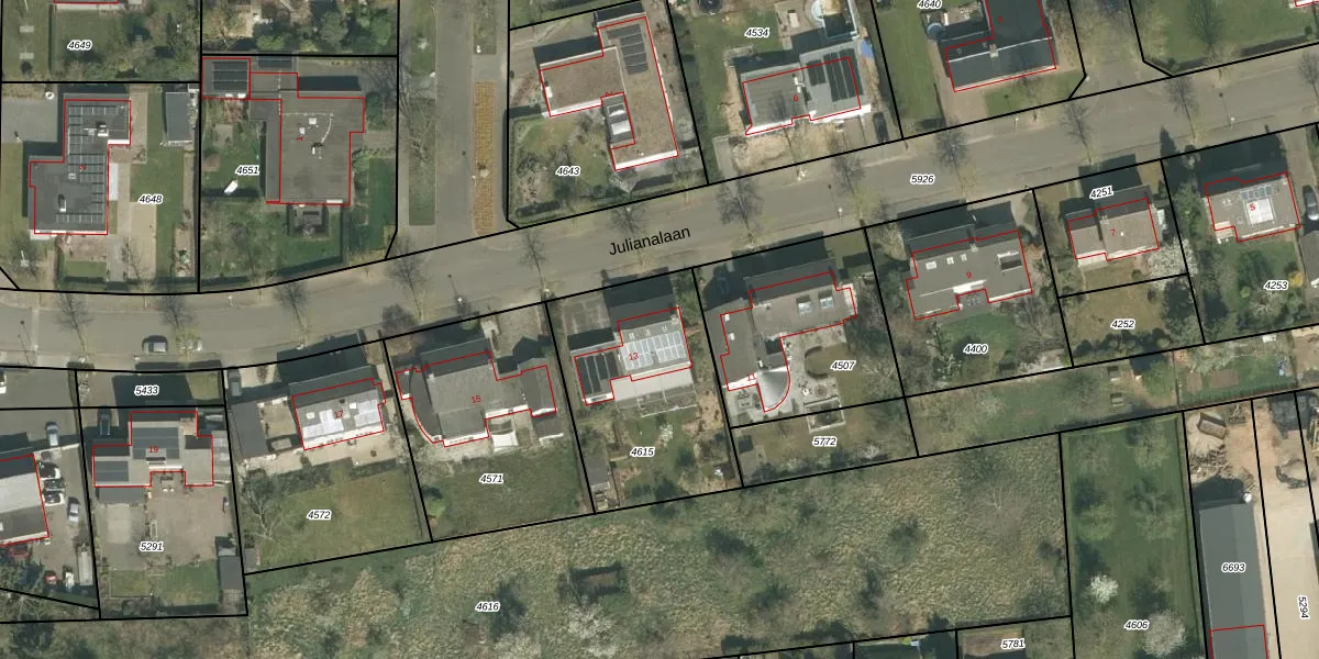 Het perceel waarop Julianalaan 13 staat heeft een oppervlakte van 767 m². Dit is een groot perceel. De perceeloppervlakte wordt geregistreerd door het Kadaster. Gedetailleerde informatie over de maten van dit perceel kunt u vinden in het rapport Kadastrale kaart met maatvoering van Julianalaan 13.