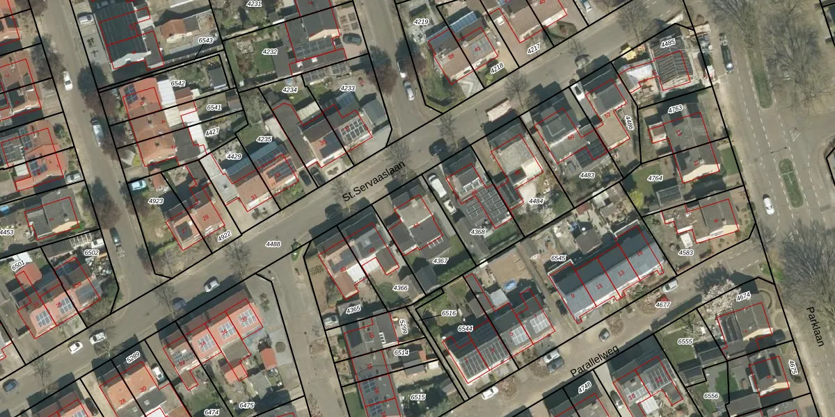Het perceel waarop St.Servaaslaan 44 staat heeft een oppervlakte van 355 m². Dit is een groot perceel. De perceeloppervlakte wordt geregistreerd door het Kadaster. Gedetailleerde informatie over de maten van dit perceel kunt u vinden in het rapport Kadastrale kaart met maatvoering van St.Servaaslaan 44.