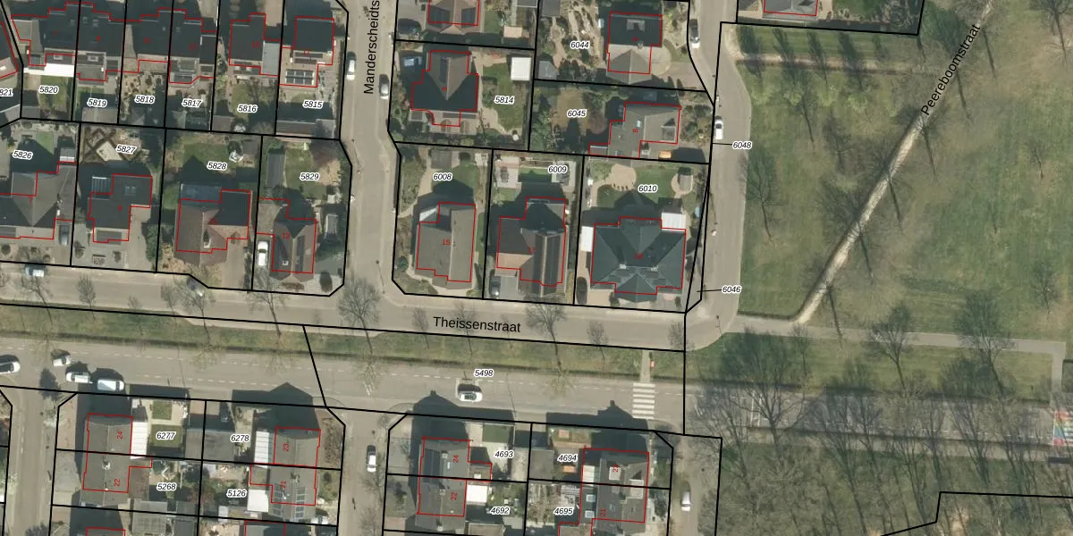 Het perceel waarop Theissenstraat 17 staat heeft een oppervlakte van 475 m². Dit is een groot perceel. De perceeloppervlakte wordt geregistreerd door het Kadaster. Gedetailleerde informatie over de maten van dit perceel kunt u vinden in het rapport Kadastrale kaart met maatvoering van Theissenstraat 17.