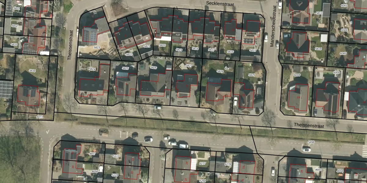 Het perceel waarop Theissenstraat 9 staat heeft een oppervlakte van 430 m². Dit is een groot perceel. De perceeloppervlakte wordt geregistreerd door het Kadaster. Gedetailleerde informatie over de maten van dit perceel kunt u vinden in het rapport Kadastrale kaart met maatvoering van Theissenstraat 9.