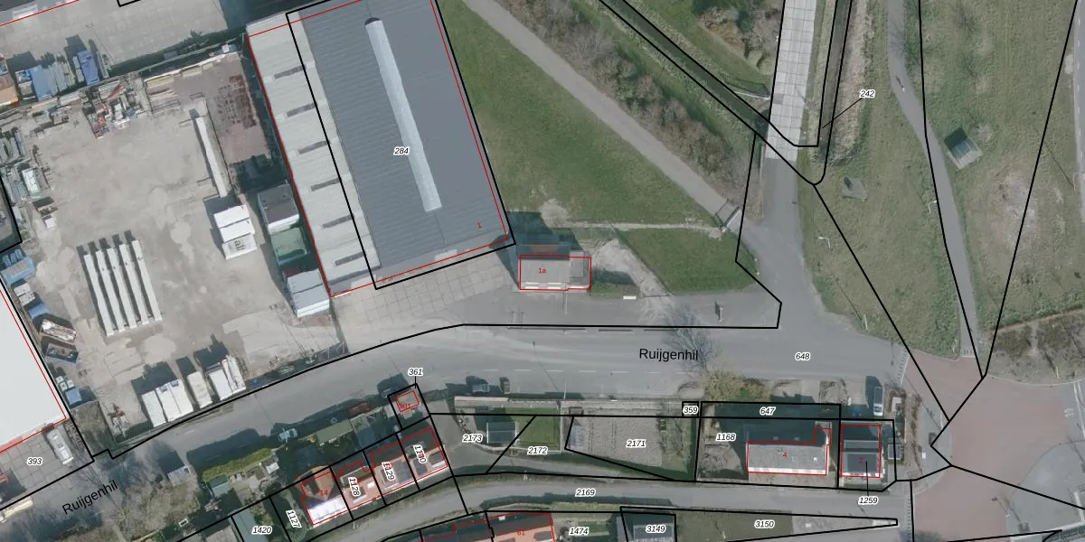 Het perceel waarop Ruijgenhil 1-a staat heeft een oppervlakte van 1,2 ha. Dit is een zeer groot perceel. De perceeloppervlakte wordt geregistreerd door het Kadaster. Gedetailleerde informatie over de maten van dit perceel kunt u vinden in het rapport Kadastrale kaart met maatvoering van Ruijgenhil 1-a.