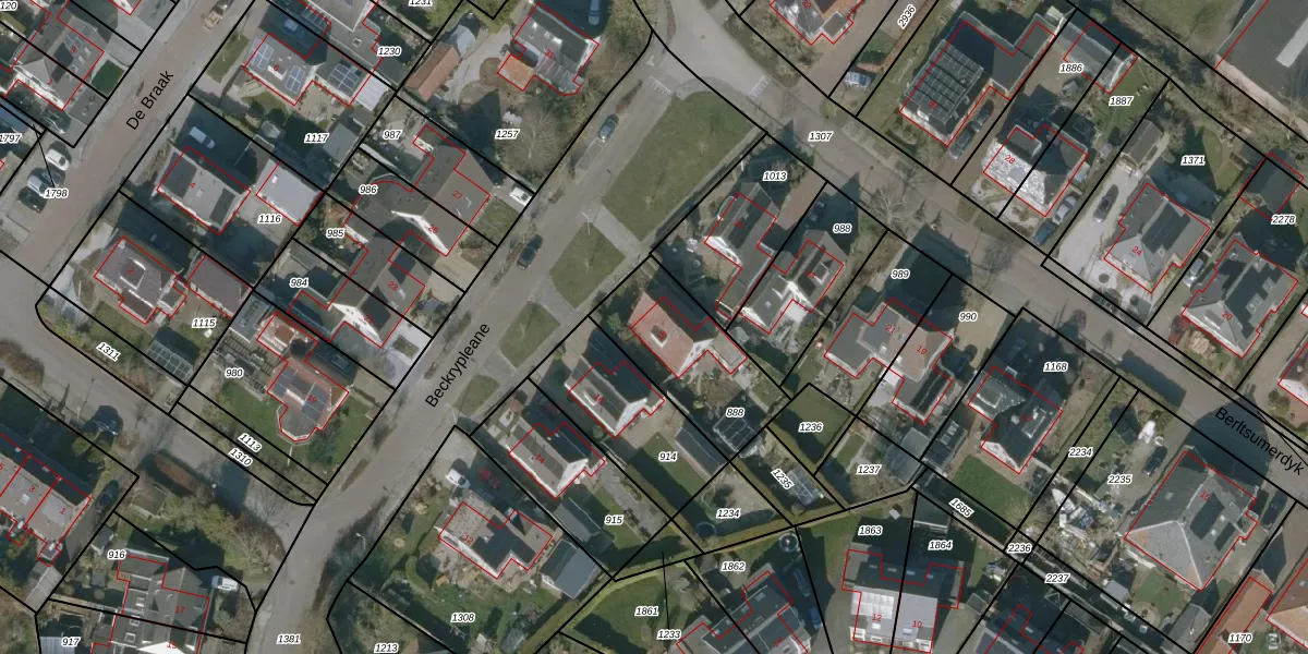 Het perceel waarop Beckrypleane 18 staat heeft een oppervlakte van 415 m². Dit is een groot perceel. De perceeloppervlakte wordt geregistreerd door het Kadaster. Gedetailleerde informatie over de maten van dit perceel kunt u vinden in het rapport Kadastrale kaart met maatvoering van Beckrypleane 18.