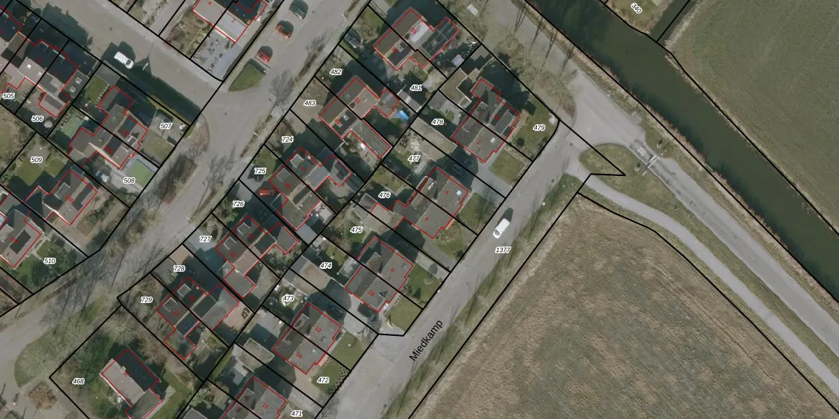 Het perceel waarop Miedkamp 6 staat heeft een oppervlakte van 320 m². Dit is een groot perceel. De perceeloppervlakte wordt geregistreerd door het Kadaster. Gedetailleerde informatie over de maten van dit perceel kunt u vinden in het rapport Kadastrale kaart met maatvoering van Miedkamp 6.