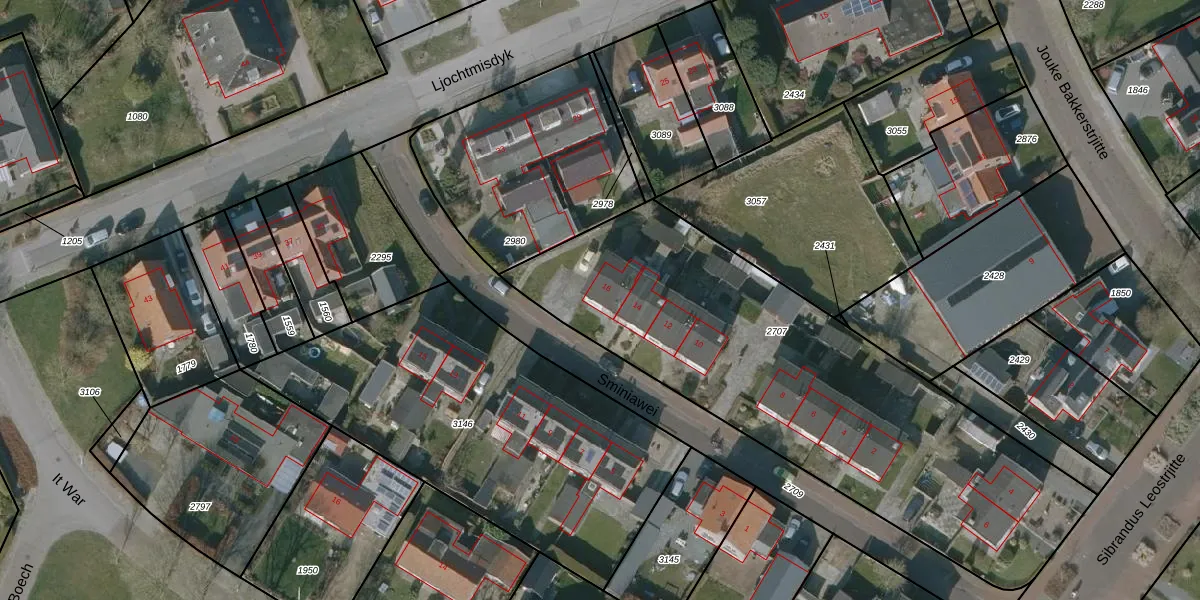 Het perceel waarop Sminiawei 16 staat heeft een oppervlakte van 2305 m². Dit is een zeer groot perceel. De perceeloppervlakte wordt geregistreerd door het Kadaster. Gedetailleerde informatie over de maten van dit perceel kunt u vinden in het rapport Kadastrale kaart met maatvoering van Sminiawei 16.
