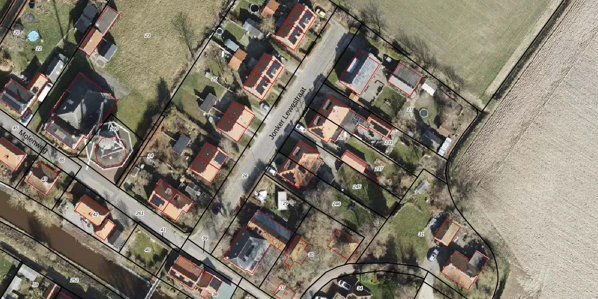 Jonker Lewestraat 5 is gelegen op kadastraal perceel LEE02I245. Deze kadastrale aanduiding is uniek en wordt gebruikt door het Kadaster om eigendomsrechten en andere zakelijke rechten vast te leggen. Het perceel maakt onderdeel uit van de kadastrale gemeente Leens.