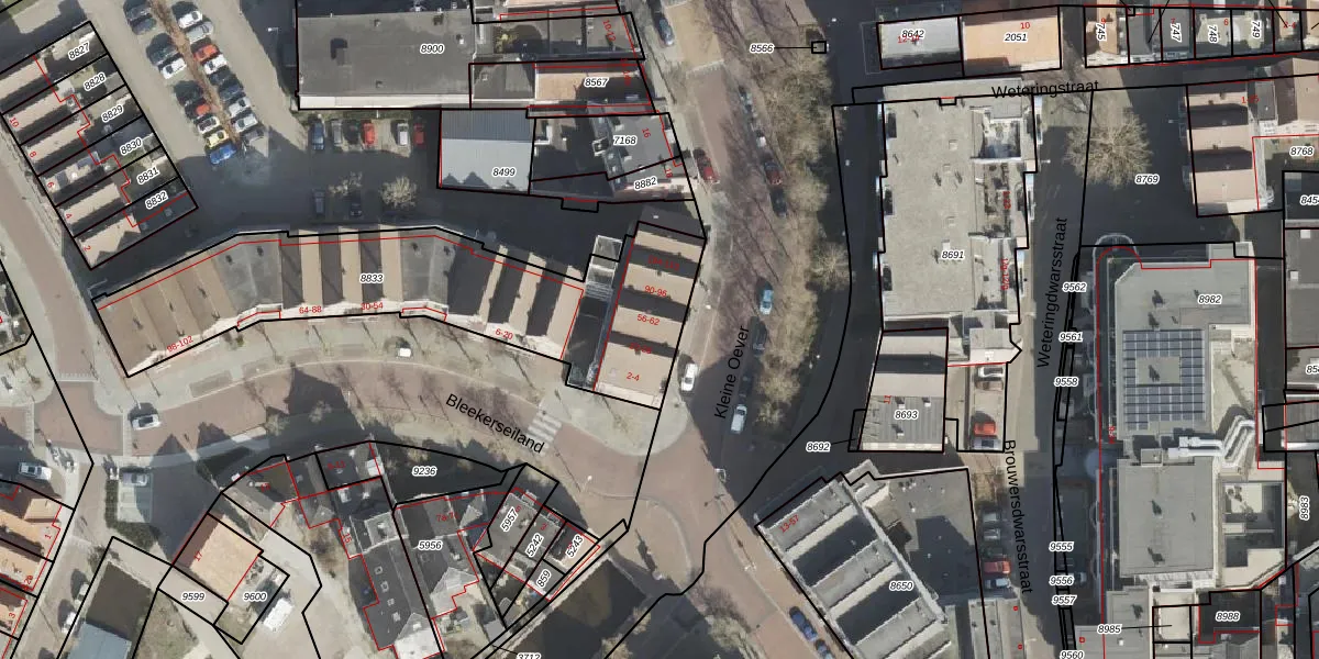 Het perceel waarop Bleekerseiland 106 staat heeft een oppervlakte van 1336 m². Dit is een zeer groot perceel. De perceeloppervlakte wordt geregistreerd door het Kadaster. Gedetailleerde informatie over de maten van dit perceel kunt u vinden in het rapport Kadastrale kaart met maatvoering van Bleekerseiland 106.