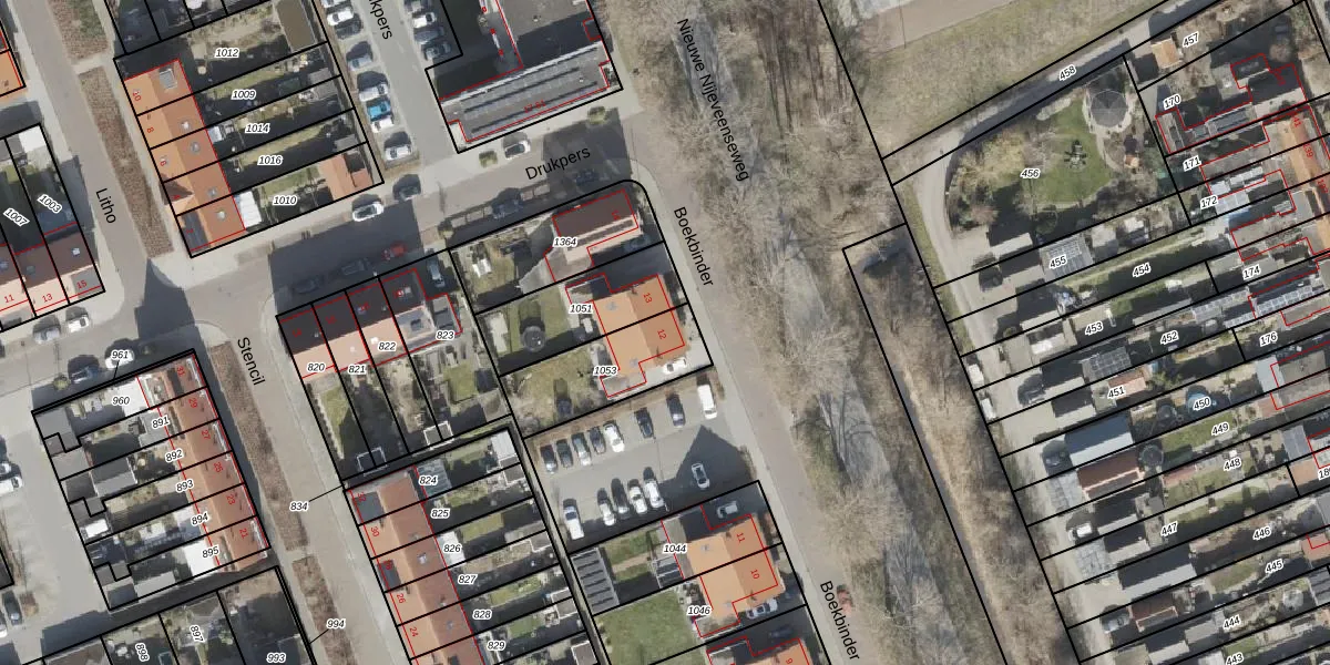 Het perceel waarop Boekbinder 12 staat heeft een oppervlakte van 308 m². Dit is een groot perceel. De perceeloppervlakte wordt geregistreerd door het Kadaster. Gedetailleerde informatie over de maten van dit perceel kunt u vinden in het rapport Kadastrale kaart met maatvoering van Boekbinder 12.