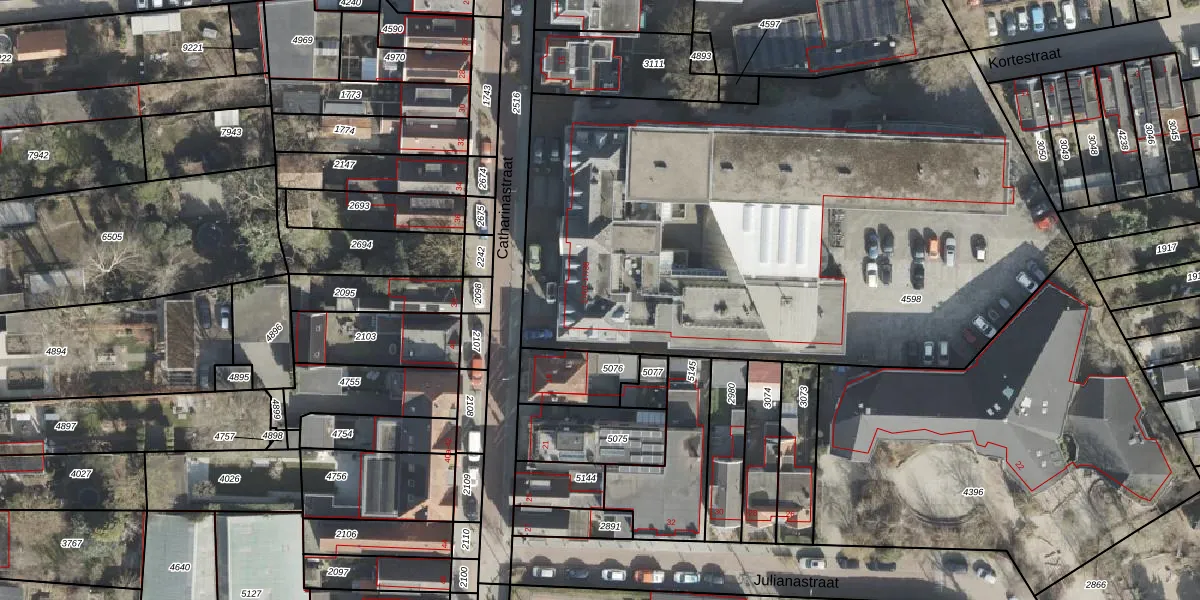 Het perceel waarop Catharinastraat 17-14 staat heeft een oppervlakte van 3827 m². Dit is een zeer groot perceel. De perceeloppervlakte wordt geregistreerd door het Kadaster. Gedetailleerde informatie over de maten van dit perceel kunt u vinden in het rapport Kadastrale kaart met maatvoering van Catharinastraat 17-14.